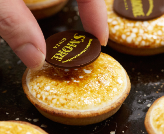 - 2017年1月 試行錯誤の結果、オリジナルの自家製マシュマロを作り上げふわとろのマシュマロが完成!しかしここで問題だったのが形状です。このふわとろのままだとクラッカーにはさむと形状を保持できない。ある日、チームのひとりから「クラッカーでサンドすることから離れよう」その言葉をきっかけに、マシュマロが保持できるタルト型が試作され炎であぶってもマシュマロが溶け出すことなく安定した形状を保てるようになったのです。最後に特製のメダルチョコをトッピング。